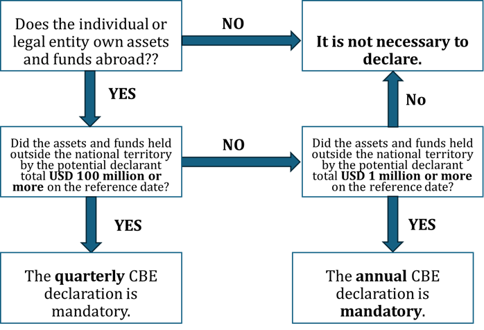 - Quarterly CBE: Required for assets equal to or exceeding USD 100,000,000.00 (one hundred million dollars) or the equivalent in other currencies on the reference dates: 03/31/2024, 06/30/2024, and 09/30/2024.